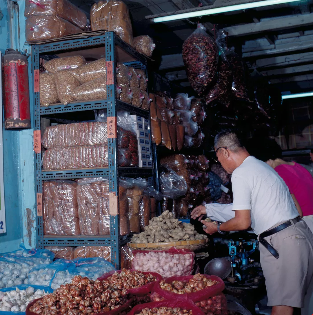 步過五顏六色的布店,空氣中傳來陣陣人蔘、甘草、當歸……的中藥味,沿路望過去,中藥商烏亮的大切刀正在藥材上霍霍揮動著。