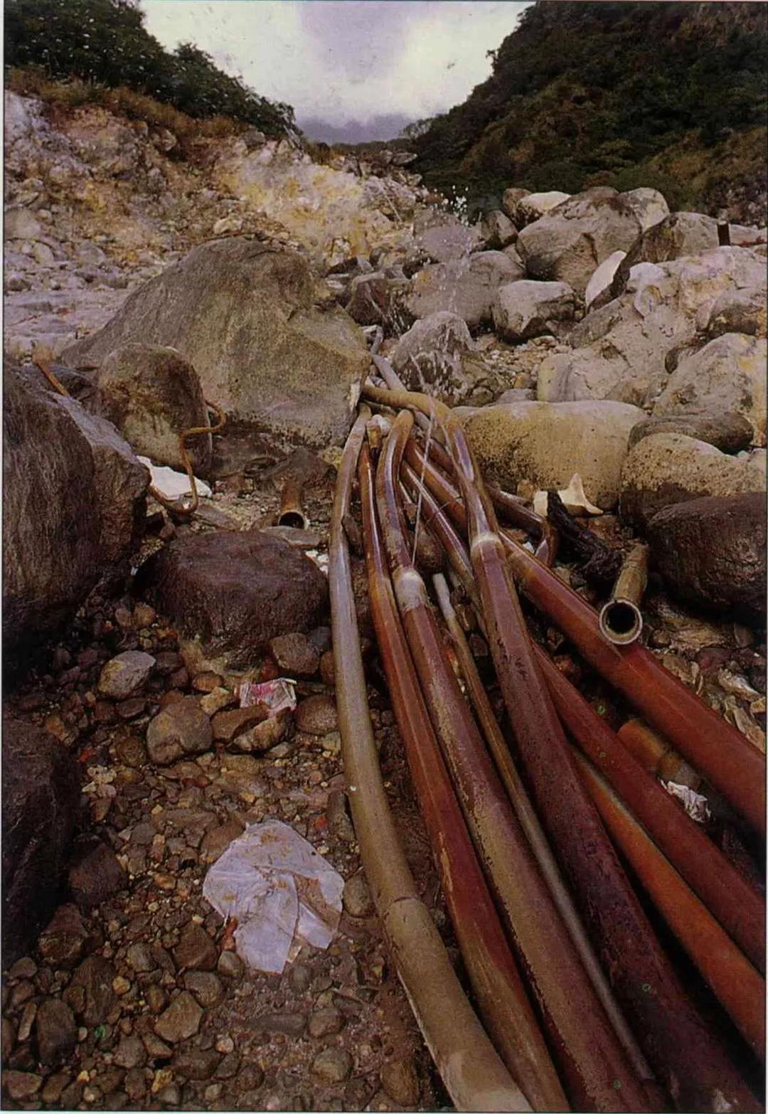 (上)在溫泉區附近的居民及旅社,都是利用接管線的方法,把熱呼呼的溫泉引入室內。
