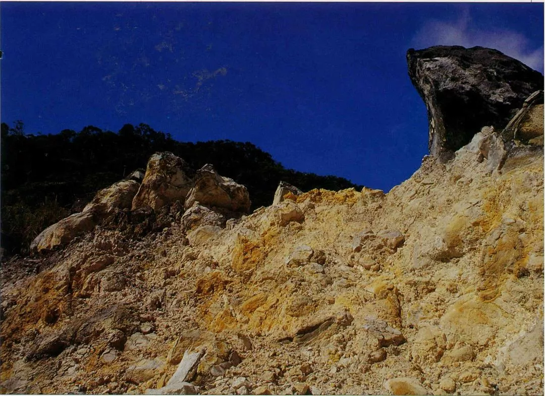 (右)如果硫氣和空氣中的氧結合,則會形成硫黃結晶附著於岩石表面。
