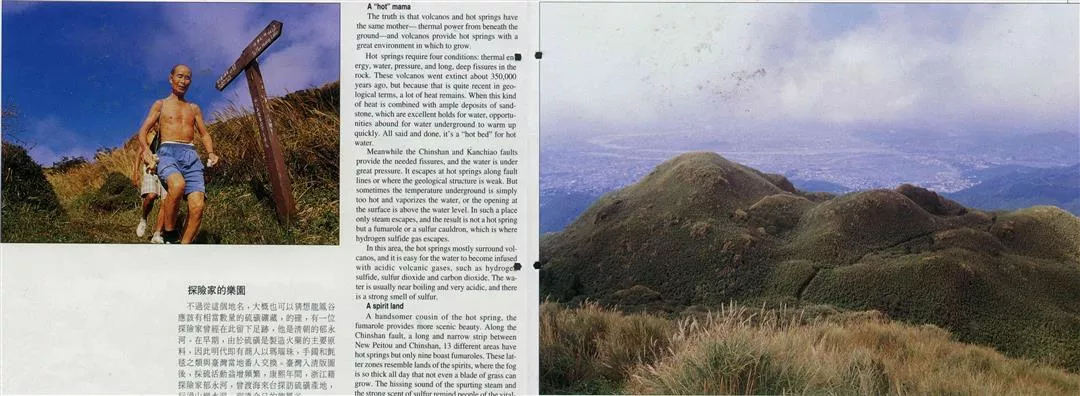在這麼寂靜的氣氛中,你一定很難想像,腳下踩著的山地,在二百八十萬年前,還只是一片比海平面高不了多少的「台北丘陵」。究竟是誰一口氣在大屯火山區中「設計」出二十座火山?而在這個區域中,溫泉露頭的地方不下二、三十處,雖然不比台灣的東北部多,但是就單位面積來說,卻是居全省之冠。同一個地方大量出現火山和溫泉,絕非事出偶然,不過它們倆的關係是不是如同生物界的父子?還是手足?來到這裡,可別忙著「相」溫泉旅館、土雞城,先靜下心來,你會發現大自然正以不同的姿態,為你展現「有聲有色」的溫泉故事。