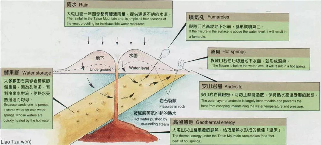 溫泉誕生的條件有四個:熱源、水、壓力及深長裂隙。大屯火山群的噴發活動在卅五萬年前平息,但因為地質年齡尚輕、餘熱猶存;再加上此區雨水豐沛,又有石英砂岩構成的良好儲水層,正是大量熱水形成的絕佳「溫床」。