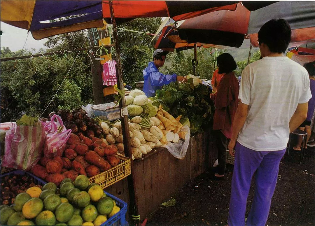 (右)陽金公路旁,可以看到攤販販賣來自竹子湖的高冷蔬菜,目前流行的中藥「川七」也在販售之列,吸引很多人潮購買。