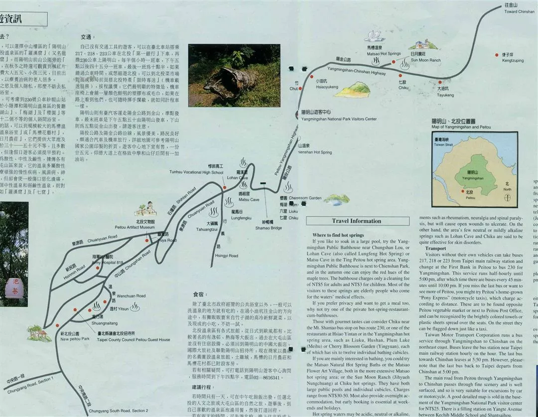 陽投公路及陽金公路沿線,風景優美,路況良好,頗適合汽車及機車旅行,詳細地圖可參考陽明山國家公園印製的折頁,遊客中心地下室有售,一份廿五元。仰德大道上在格致中學和山仔后間有一加油站。