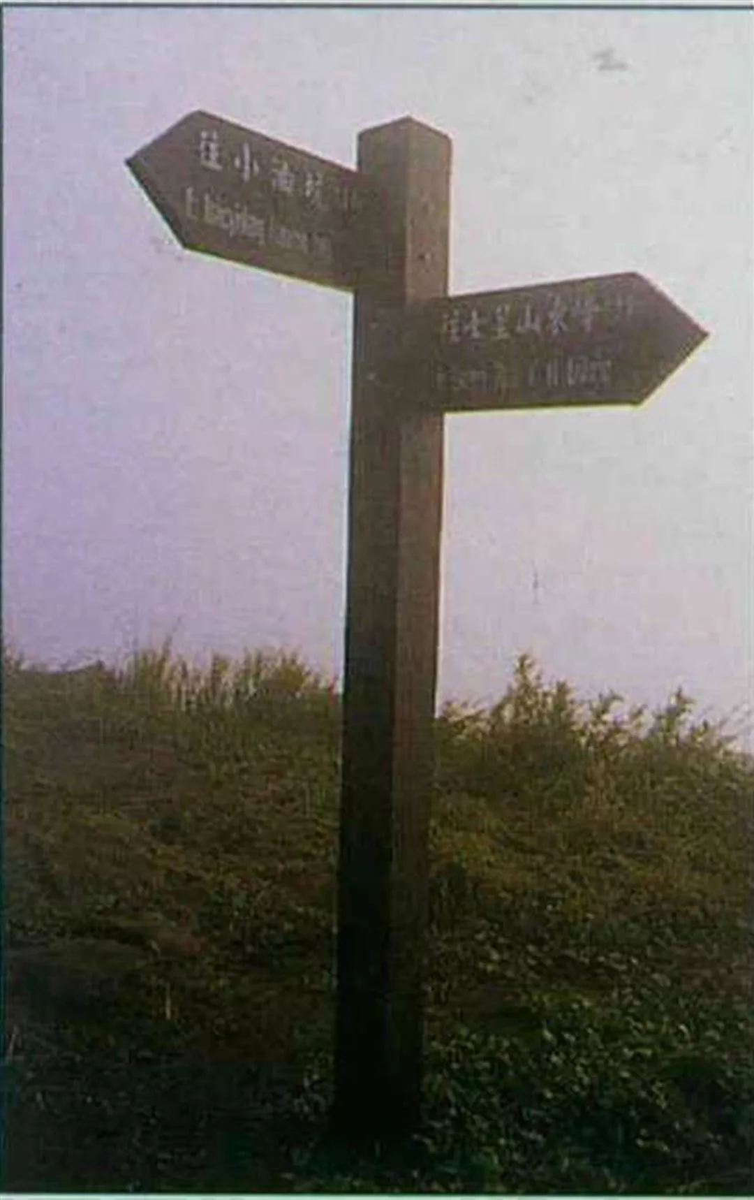 橋的彼端有一條石板舖的小徑,終點的二層紅磚屋大半被高至膝蓋的雜草圍繞,顯然已經廢棄多時;然而屋前四處遊走的公雞、母雞,以及門邊的招牌「台北縣議會」、「北投招待所」,卻都暗示著人蹤,我們決定上前敲門。一位綽號「阿堯」、看起來不超過四十歲的北投在地青年應聲而來,他目前幫台北縣政府看顧這裡,恰巧另外也有來自縣政府的兩位訪客,在獲悉我們的來意之後,爽快地答應擔任嚮導。