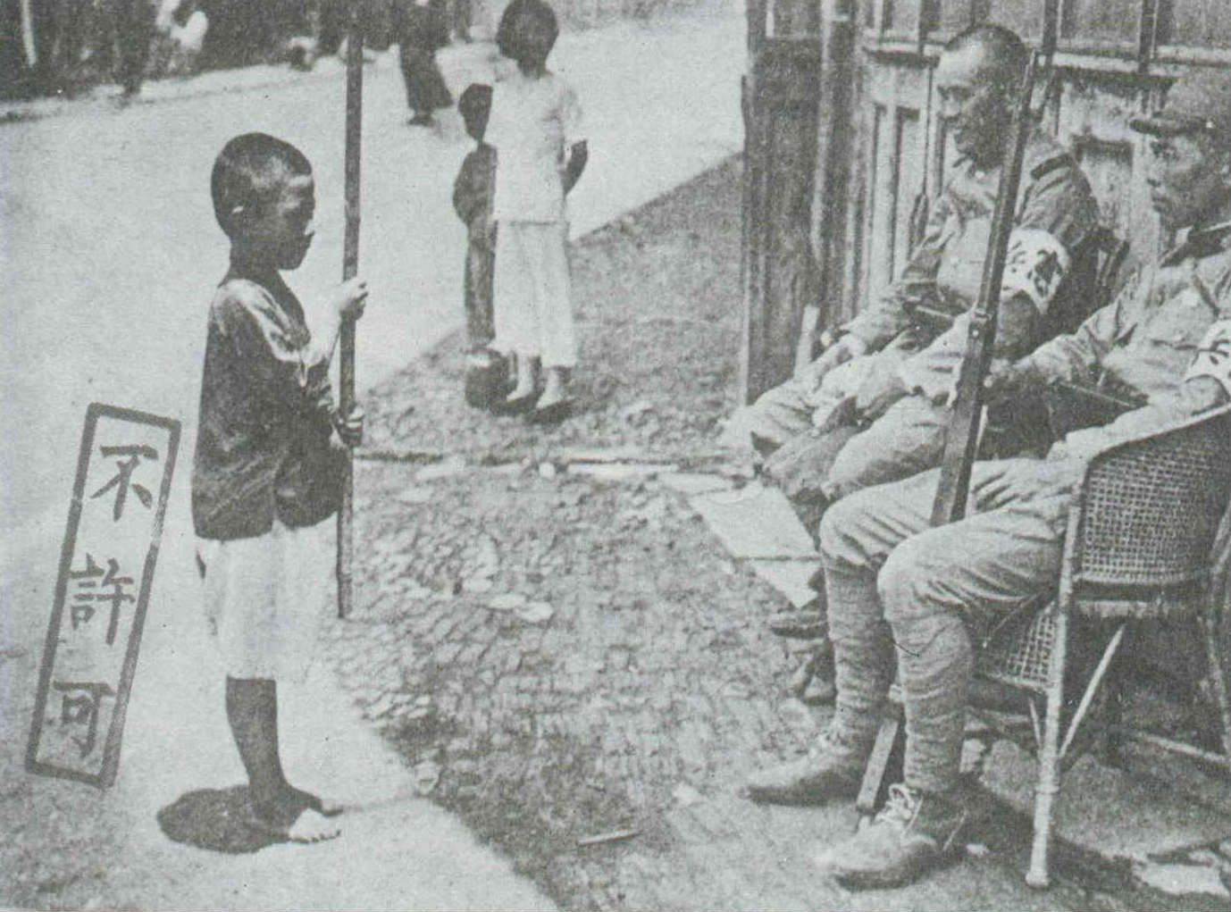 日軍侵華期間,叫小孩舉槍敬禮來滿足征服慾的日本憲兵。