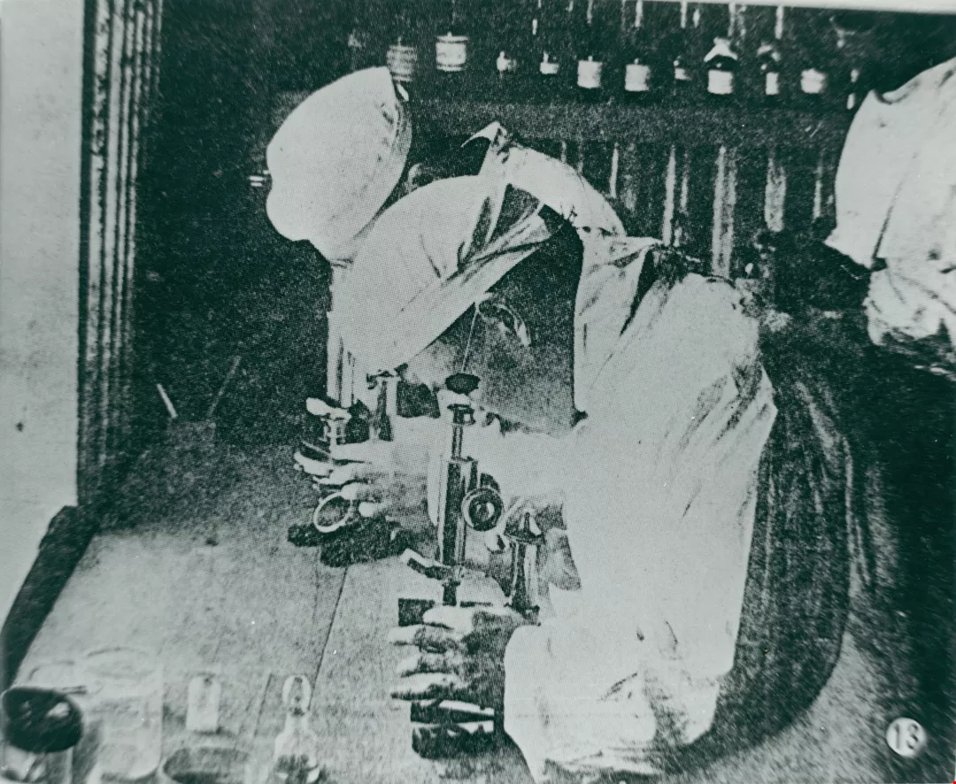 日本醫官用顯微鏡觀察病菌繁殖的情形。