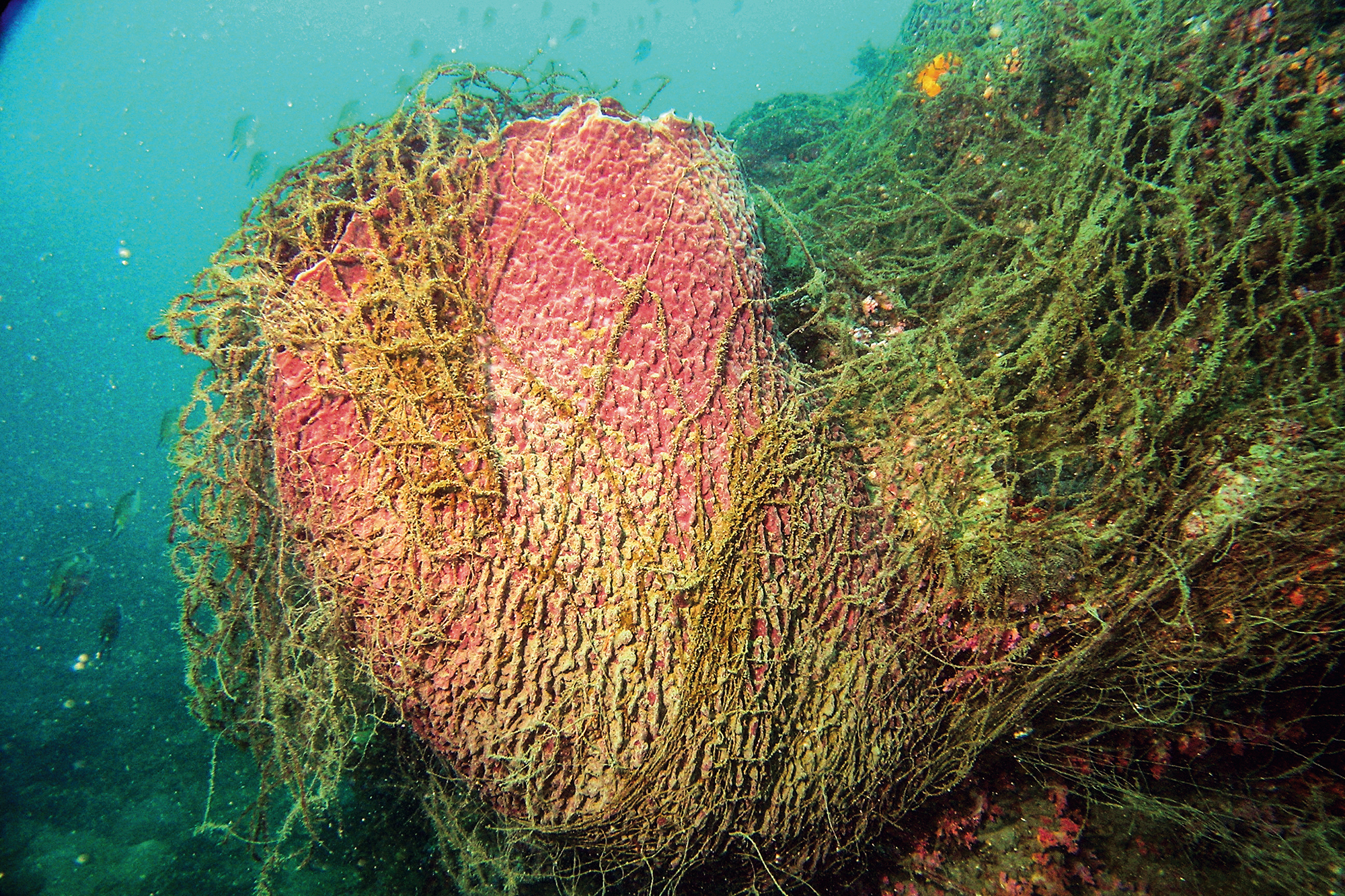 被隨意丟棄的流刺漁網纏繞在桶狀海綿上,影響海底生態。