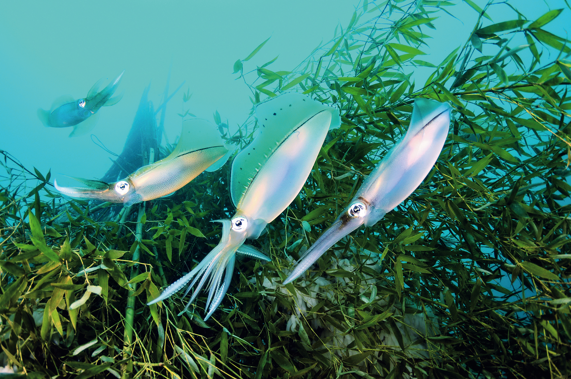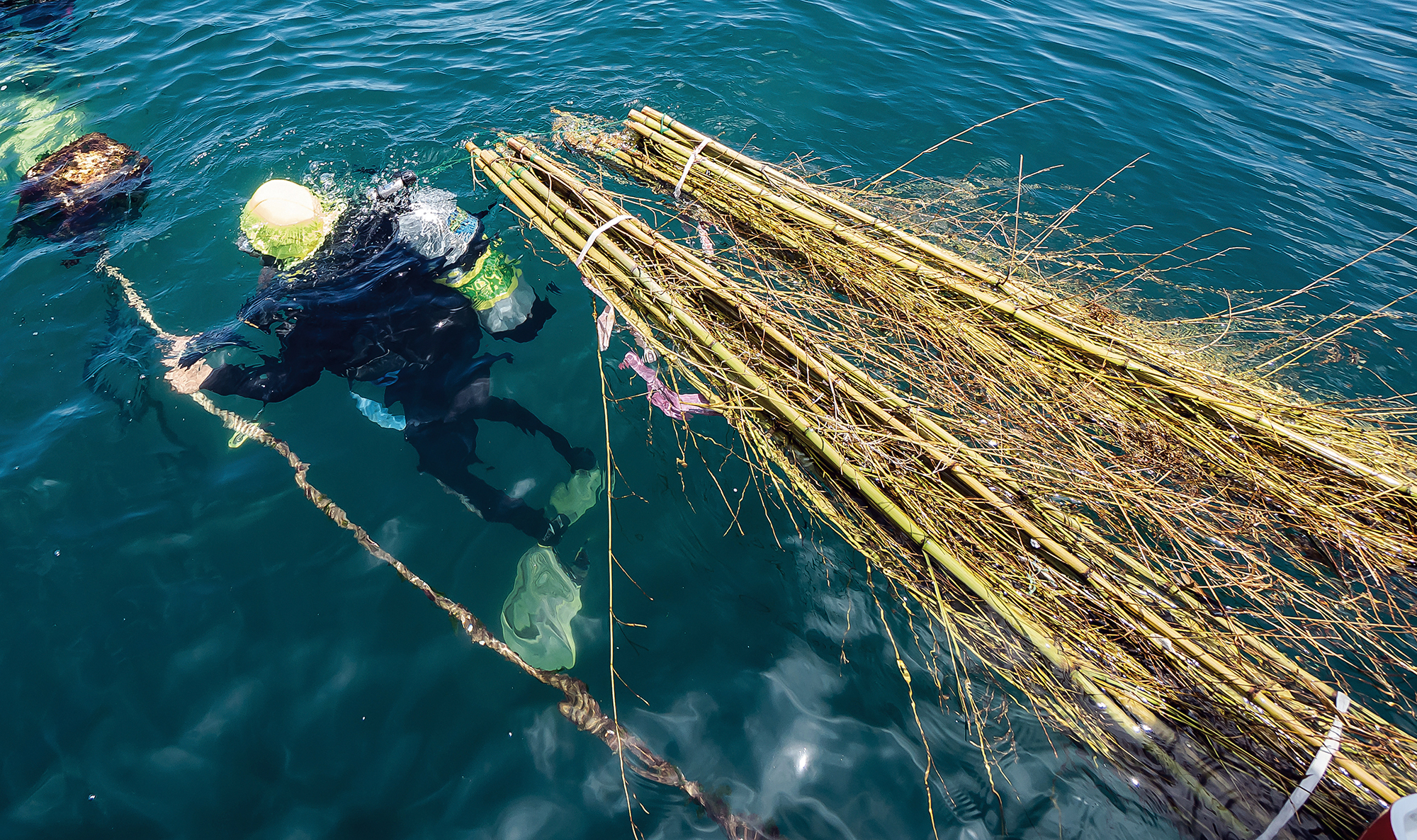 軟絲在竹叢礁鄰近恣意游動,竹叢礁則會逐漸腐爛,回歸自然,不影響當地生態。