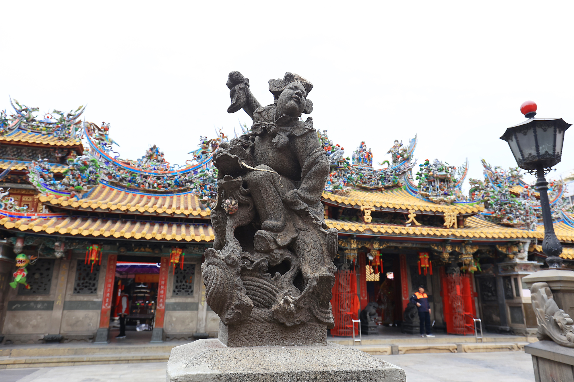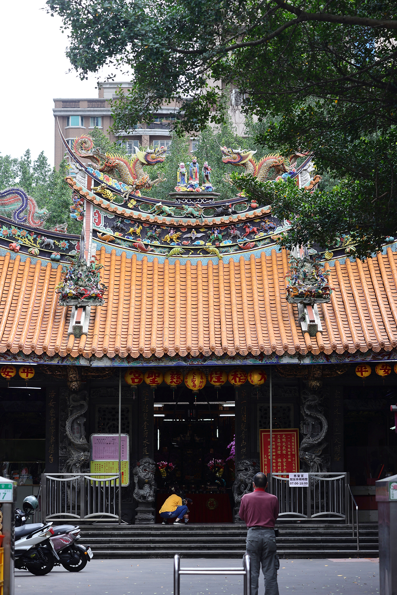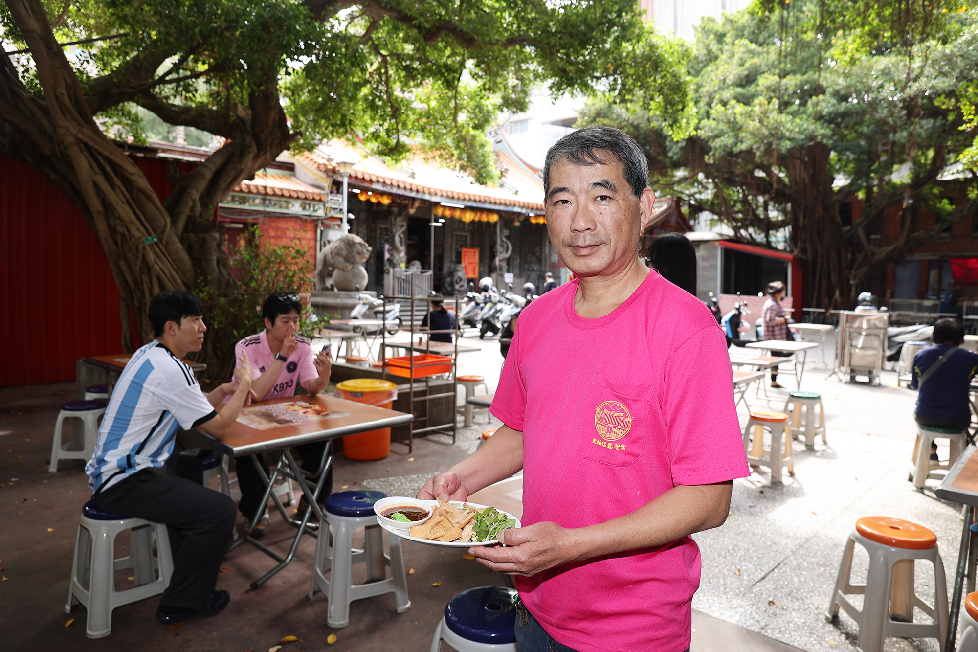 如今坐滿遊客的廟埕,更是承載了他兒時的回憶。抬頭看向廣場旁幾棵茂密彷彿可蔽天的榕樹,鍾麗淇笑說:「這裡的每棵樹我都上去過,廟前的石獅子我和我兒子也都爬過。」他回憶,父母親忙碌做生意時,他常和一群朋友在廟前到處跑,抓鳥、掏鳥巢,玩得不亦樂乎,還會守在廟門口等被留下的結緣供品。