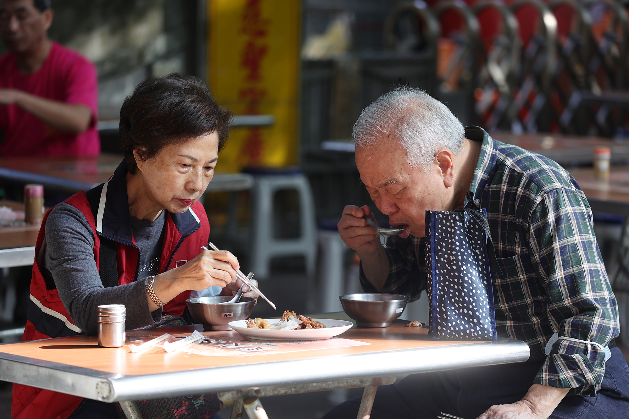 一張鐵桌、數個鐵椅,民眾吃著鹹粥和小菜,廟前廣場氣氛愜意悠然。