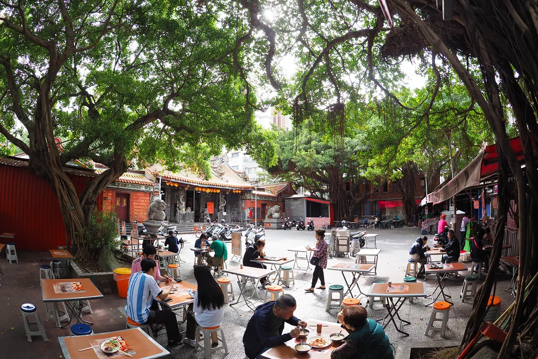 作為知名觀光景點,大稻埕慈聖宮廟前美食街名聲遠播,許多人就愛坐在廟埕榕樹下,悠閒地吃飯和談天。