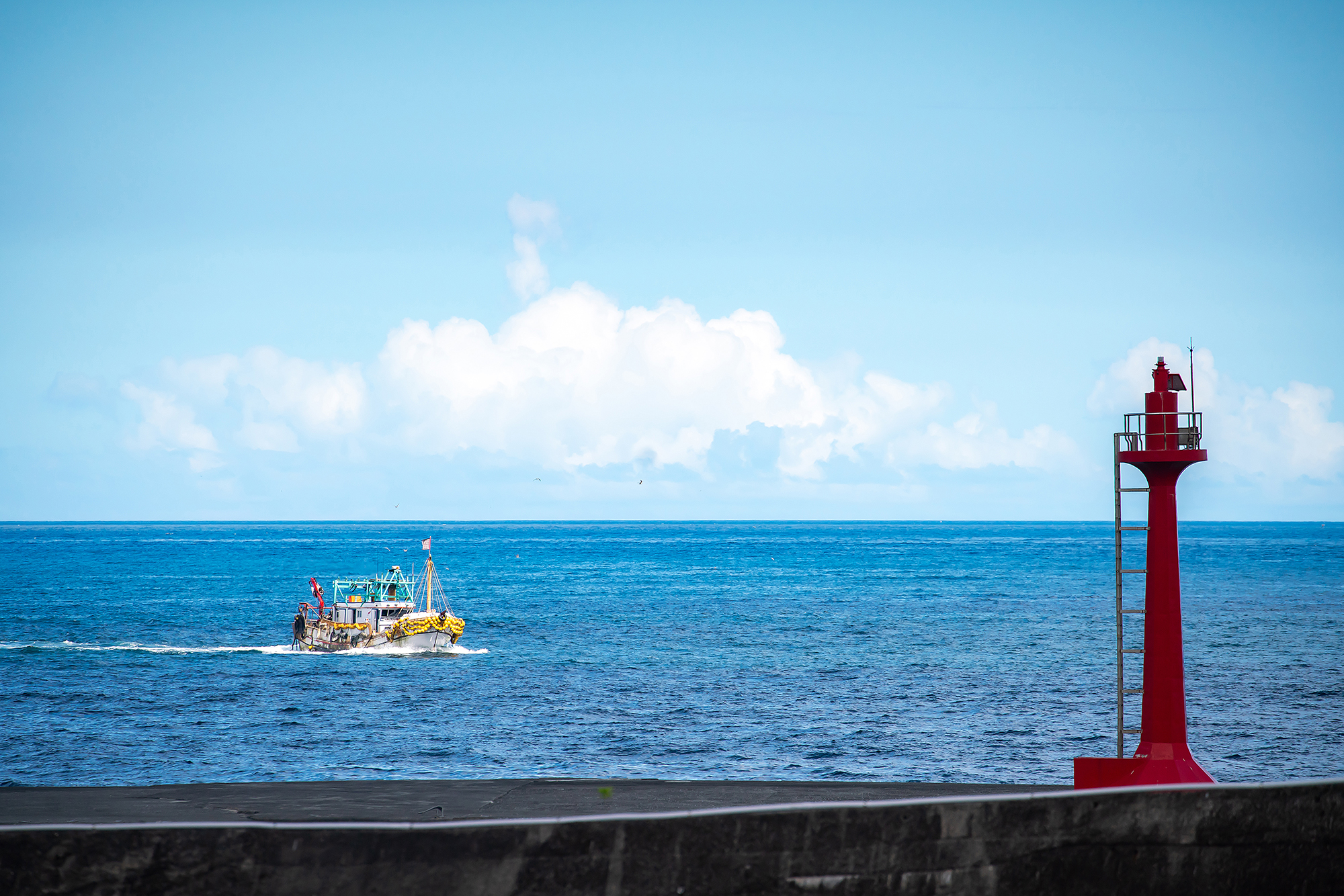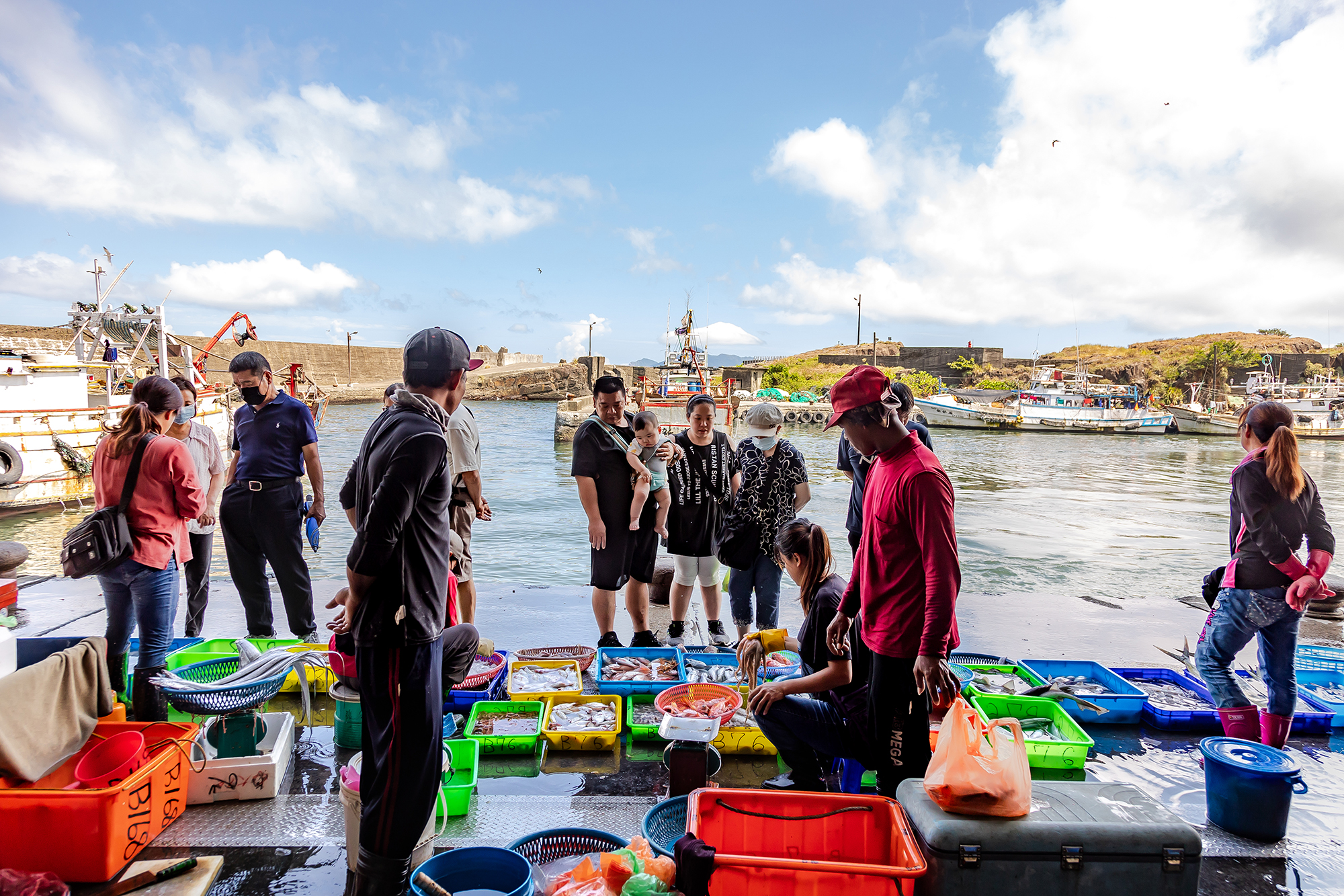 為了深入了解此一概念的意涵,我們跟著黃之暘的腳步來到宜蘭頭城的大溪漁港。夏日萬里晴空,小小的漁港與龜山島遙望,午後,把握早流出海的漁船陸續進港,船靠岸停妥,漁民眼明手快地將船上一籃籃的漁獲卸貨上岸。