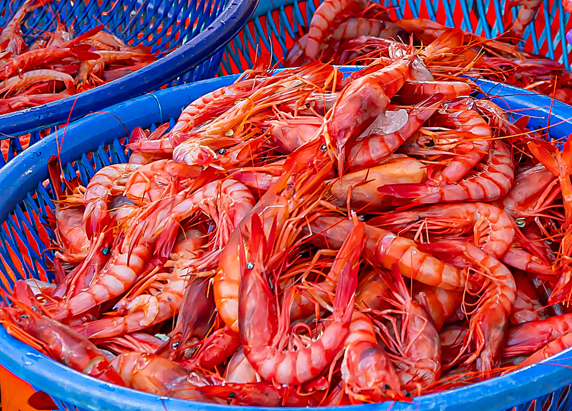 放眼望去,這個季節,色澤嫣紅到粉櫻的蝦類是市場上的主力。如懷抱紫色蝦膏,因而被魚販稱「葡萄蝦」的鬚蝦;披覆著橘紅硬殼,造型猶若小龍蝦的角蝦;以及蝦頭碩大,身懷藍綠色蝦卵,被俗稱為「蝦母」的異腕蝦……。