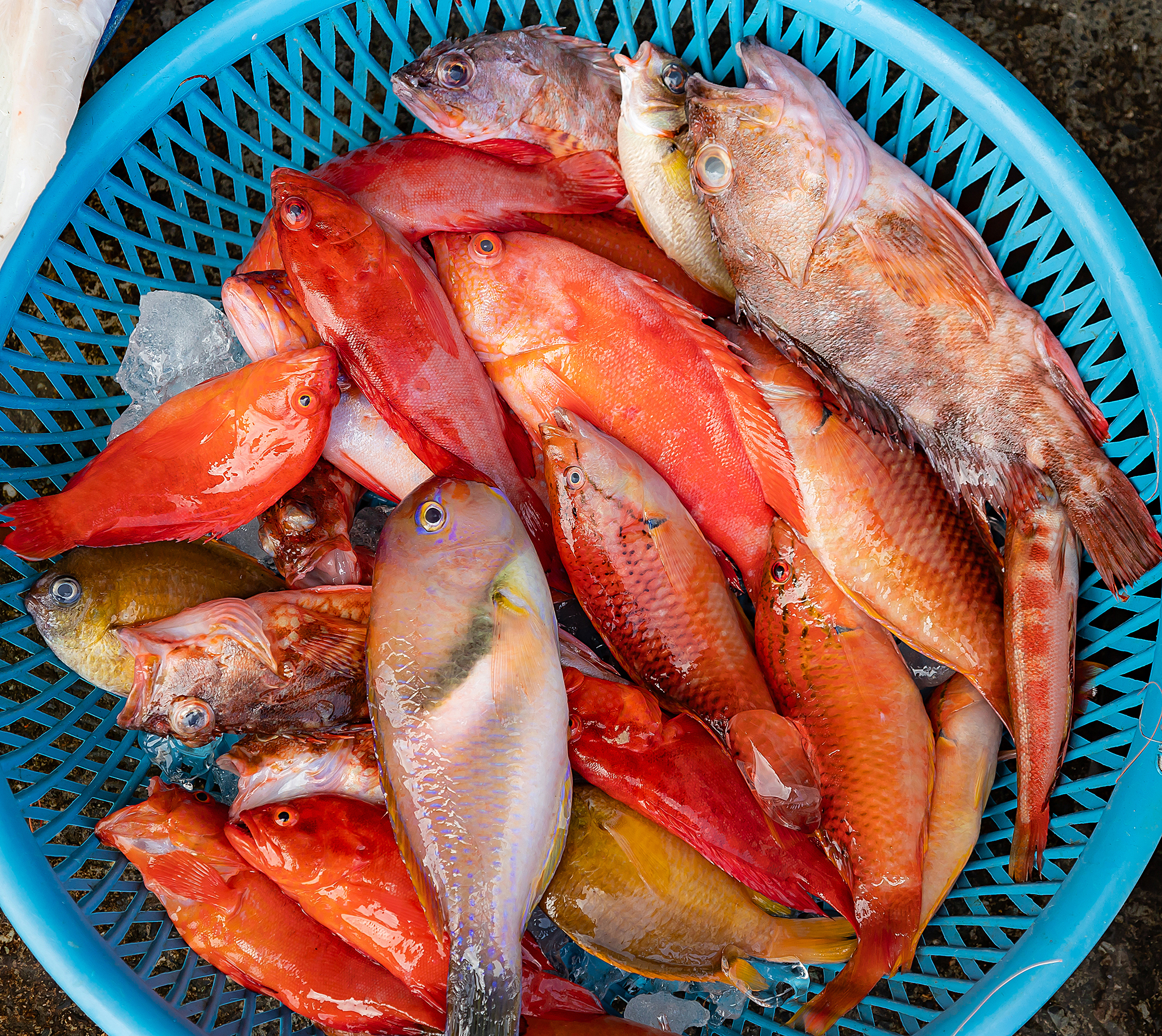 產地市場常能見到,因數量較少,被集中販售的魚鮮。光這一簍就包括了石斑、石狗公、雀鯛等不同品種。