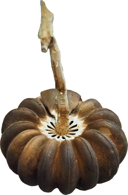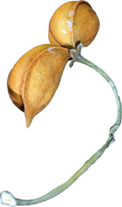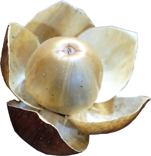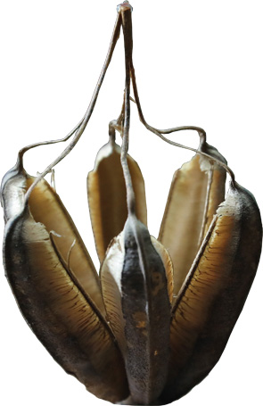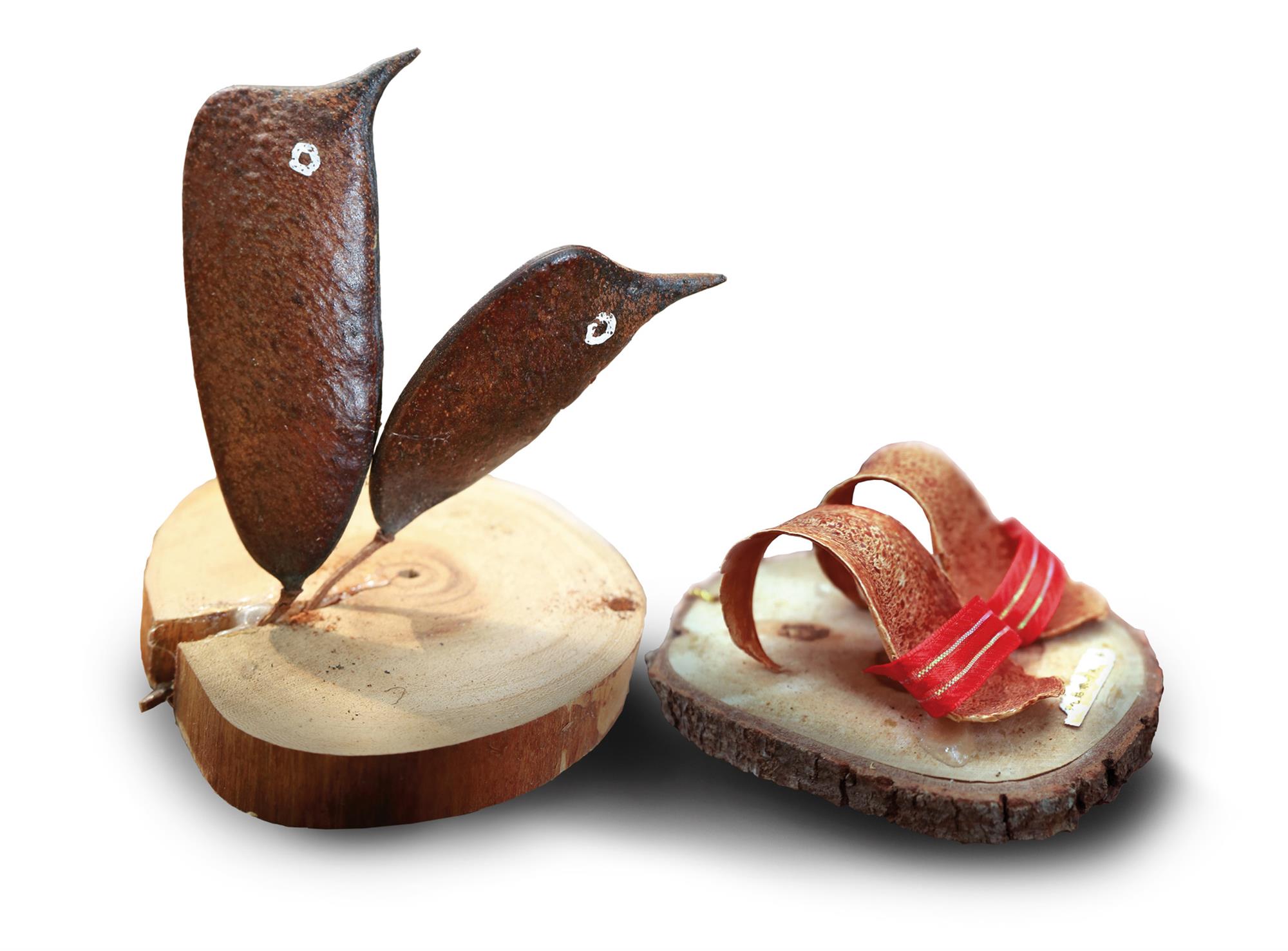 梁崑將又拿出形如一朵乾燥花的木玫瑰種籽,它與牽牛花同屬旋花科,開花後,萼片會木質化,種籽被包覆其中。它金銅的顏色讓小鳥以為是枯葉,而不會啄食。漏斗狀的花形口向著天空,當雨來時,被注滿水,種籽的外殼被軟化破壞,種籽就隨著水流離開母體,開始尋找土壤的旅程。