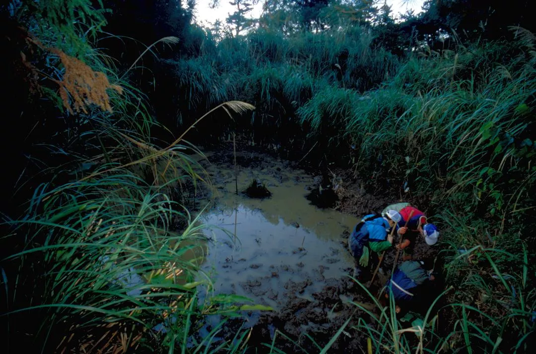 野生動物的生態調查是人工復育的第一步。圖為台大動物系在陽明山做台北樹蛙的調查。(張良綱)