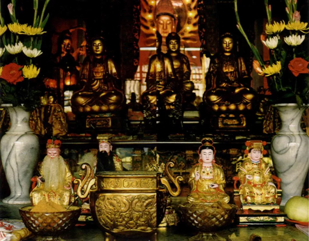 前面曾提到過,龍山寺並非一所純粹的佛教寺廟,所以在供觀音菩薩的前殿,信徒們是以鮮花素果祭拜,他們稱為「拜素」。而後殿因為供的是民間所信仰的媽祖,就可以「拜葷」了,供品中不乏雞、鴨、魚、肉,十分豐盛。