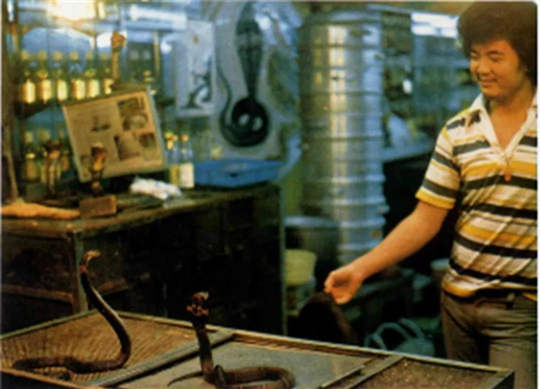 蛇店供應蛇膽、蛇鞭、蛇血與蛇湯,現殺現煮,十分「恐怖」。據說蛇有清火、明目、強肝等作用,所以當蛇店老闆在門口當場表演殺蛇時,總會有客人上門,等著生吞蛇膽,據說蛇膽的效果要比蛇血和蛇湯高,尤其是毒蛇膽,據說效果更好。看著有人用高粱酒一骨碌吞下一個生膽,一點也沒有不適的表情,實在叫人困惑。