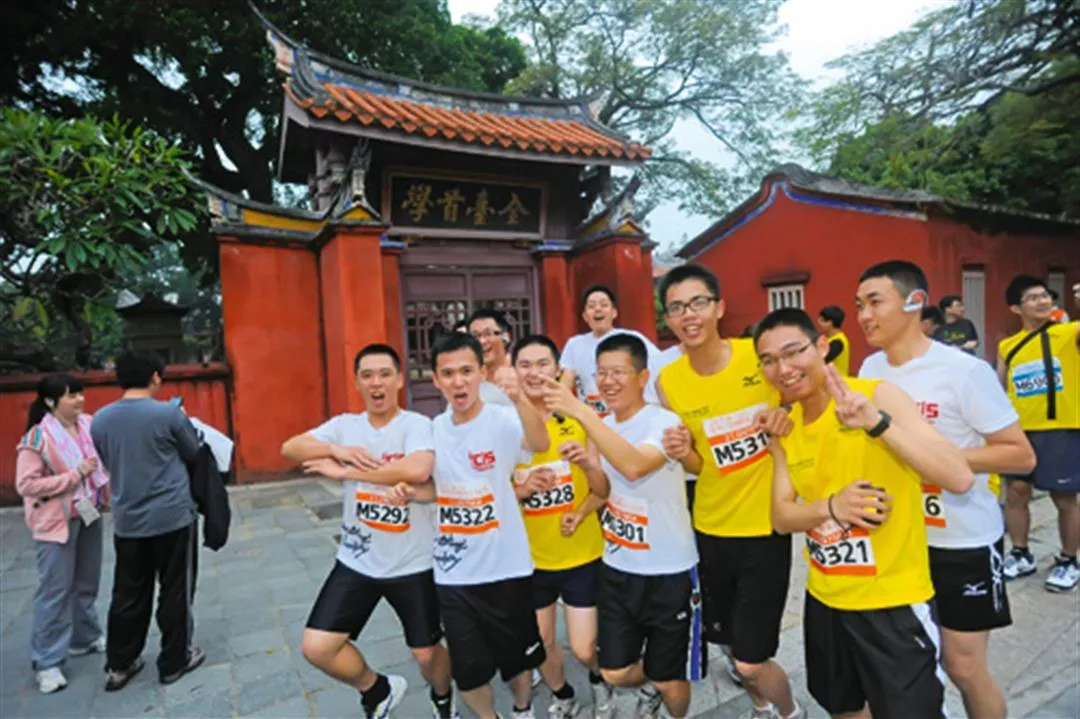 沿著古都老街慢跑,各式變裝路跑者讓馬拉松有了類似嘉年華的效果,同學們經過孔廟也要相揪留影。