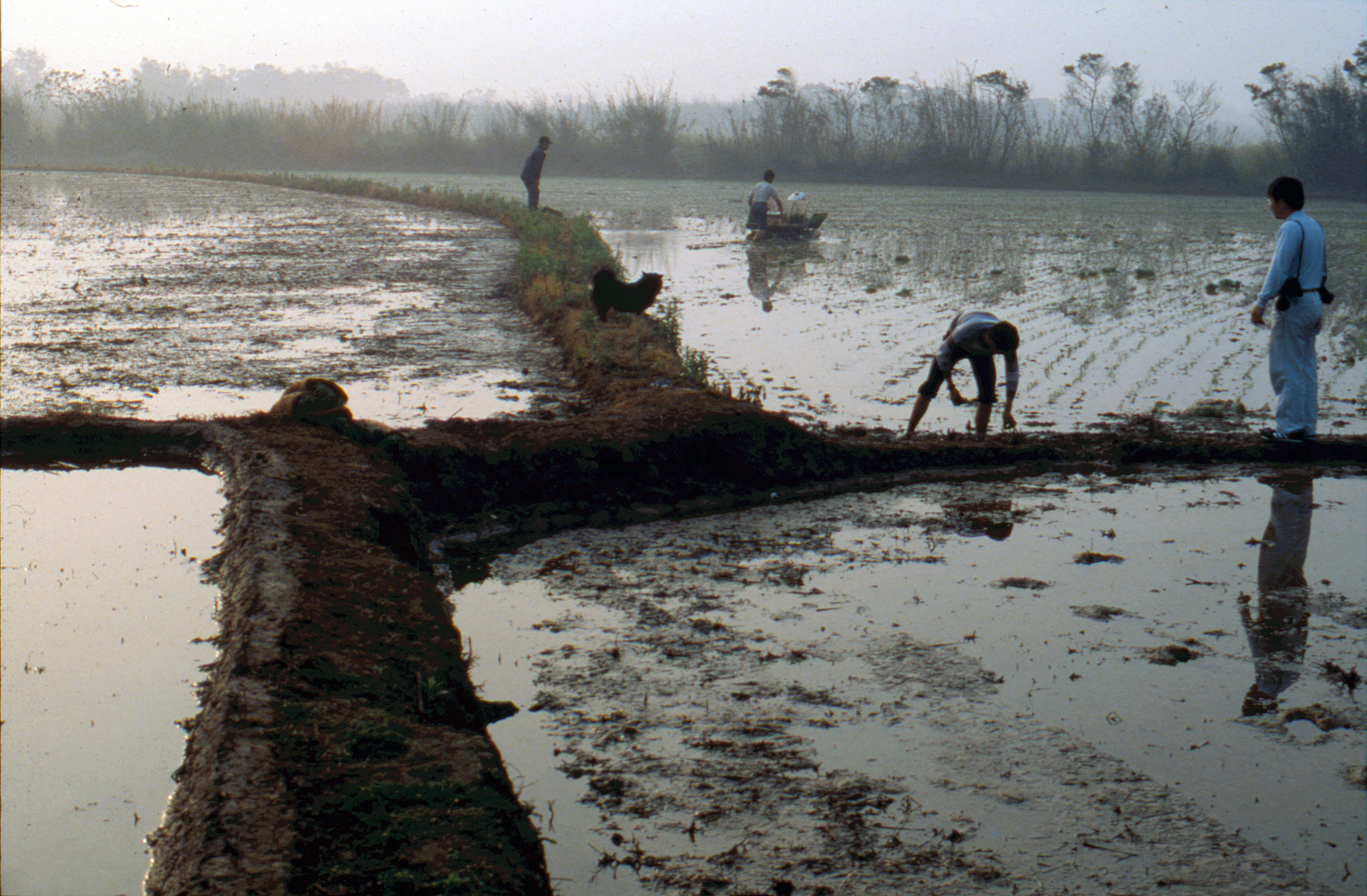 晨霧中的新屋鄉,農民在田裏忙著插秧育苗,辛勤幹活兒。(王煒昶)