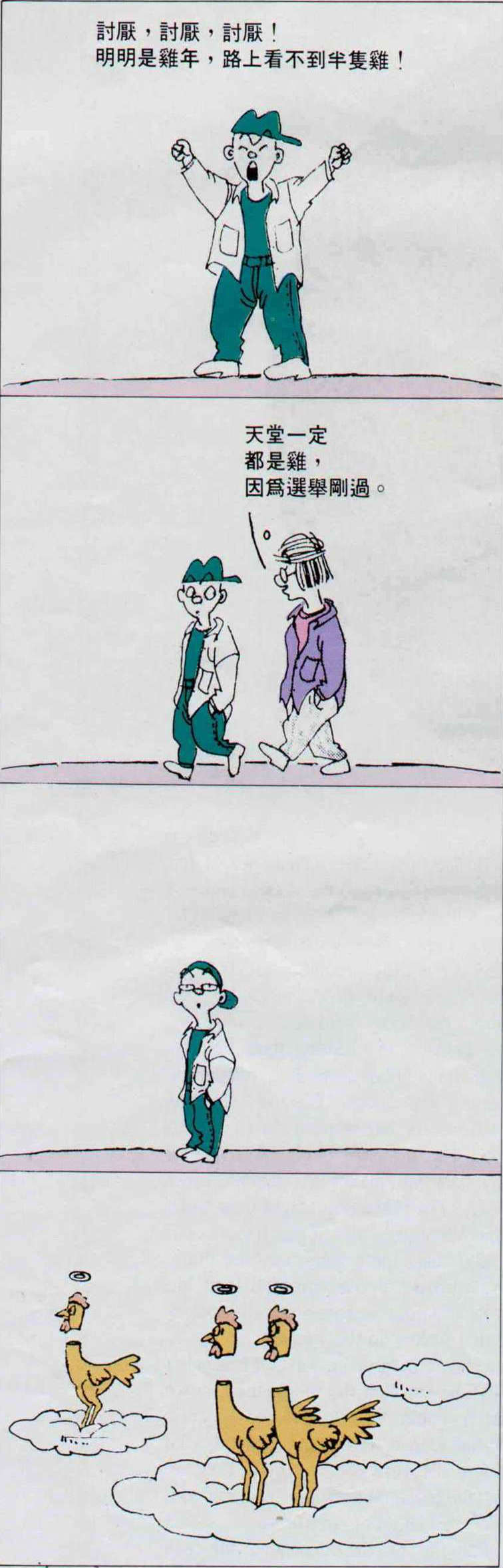 結局是國君再問,紀渻子回答:差不多了,無論對手如何鳴叫挑戰,他都能無動於衷,毫不理睬,看起來簡直就是一隻木雕的雞。如此能內守其性,不受外界刺激影響,「雞王」已經訓練成熟,所有的雞都不是對手,一看到牠,只有掉頭逃跑的份兒。