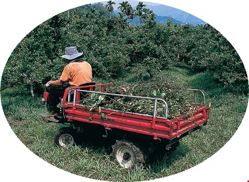 溪底遙以無農藥栽培柳丁,需付出加倍辛勞。比如修剪後的枝條必須收集運出果園,以避免就地腐化滋生病菌。(右下)為了防止星天牛在樹頭產卵,必須一棵棵釘上木樁、圍上防護網,並且經常巡視修護。