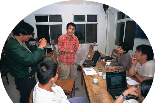 溪底遙的農事會議上,為防治蟲害,廖學堂(中立者)拿出荔枝套袋的樣本,建議龍眼比照使用,大家正討論各種方案的利弊得失。