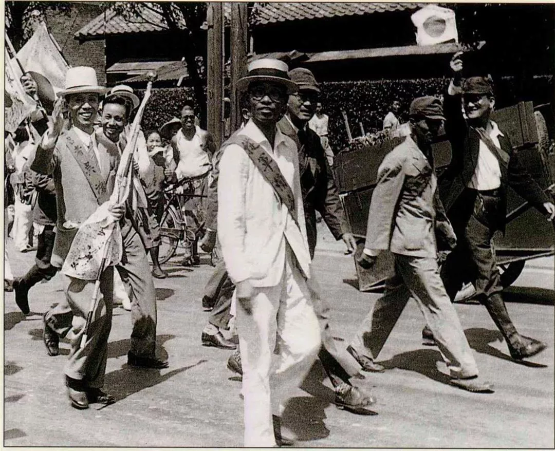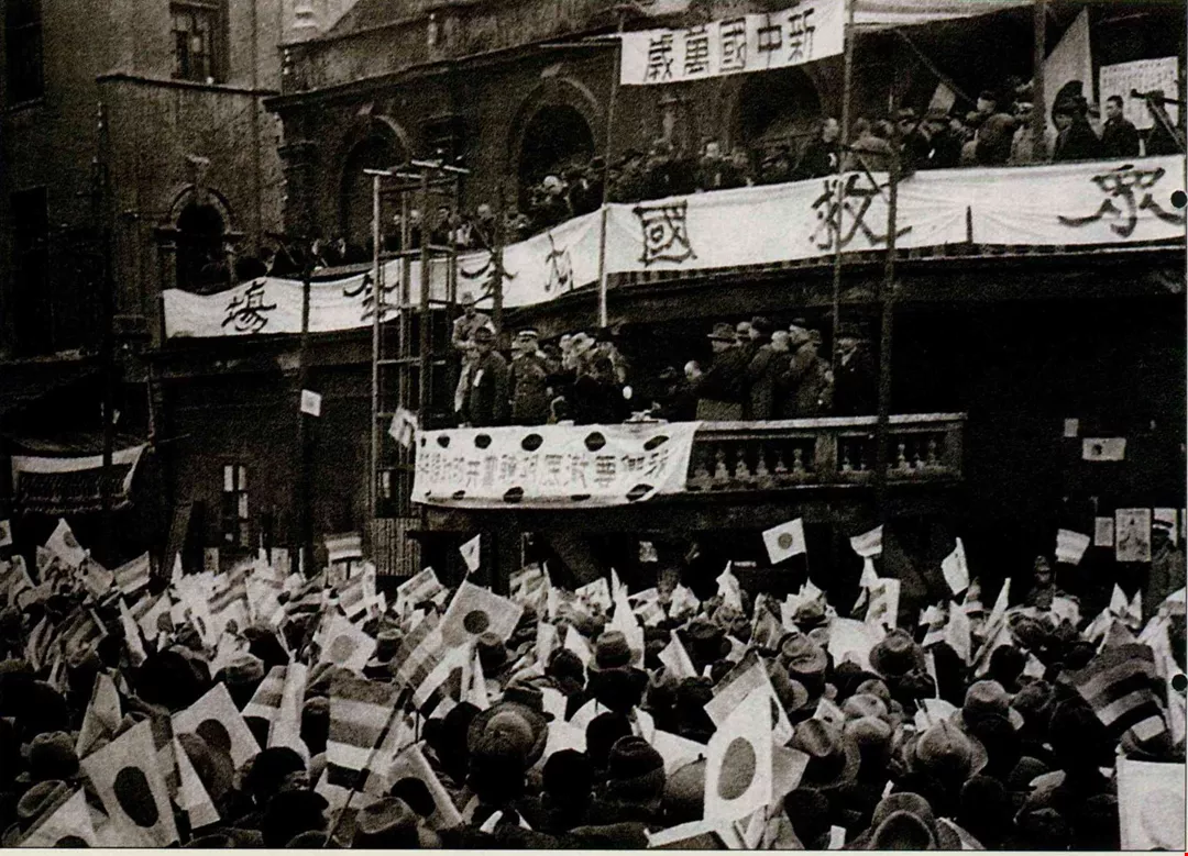 日本媒體在武漢淪陷後所拍的宣傳照。圖說寫著:「高舉建立東亞新秩序口號、邁向日支合作的漢口市民在救國大會上,宣誓『興亞』。」(取材自朝日新聞)