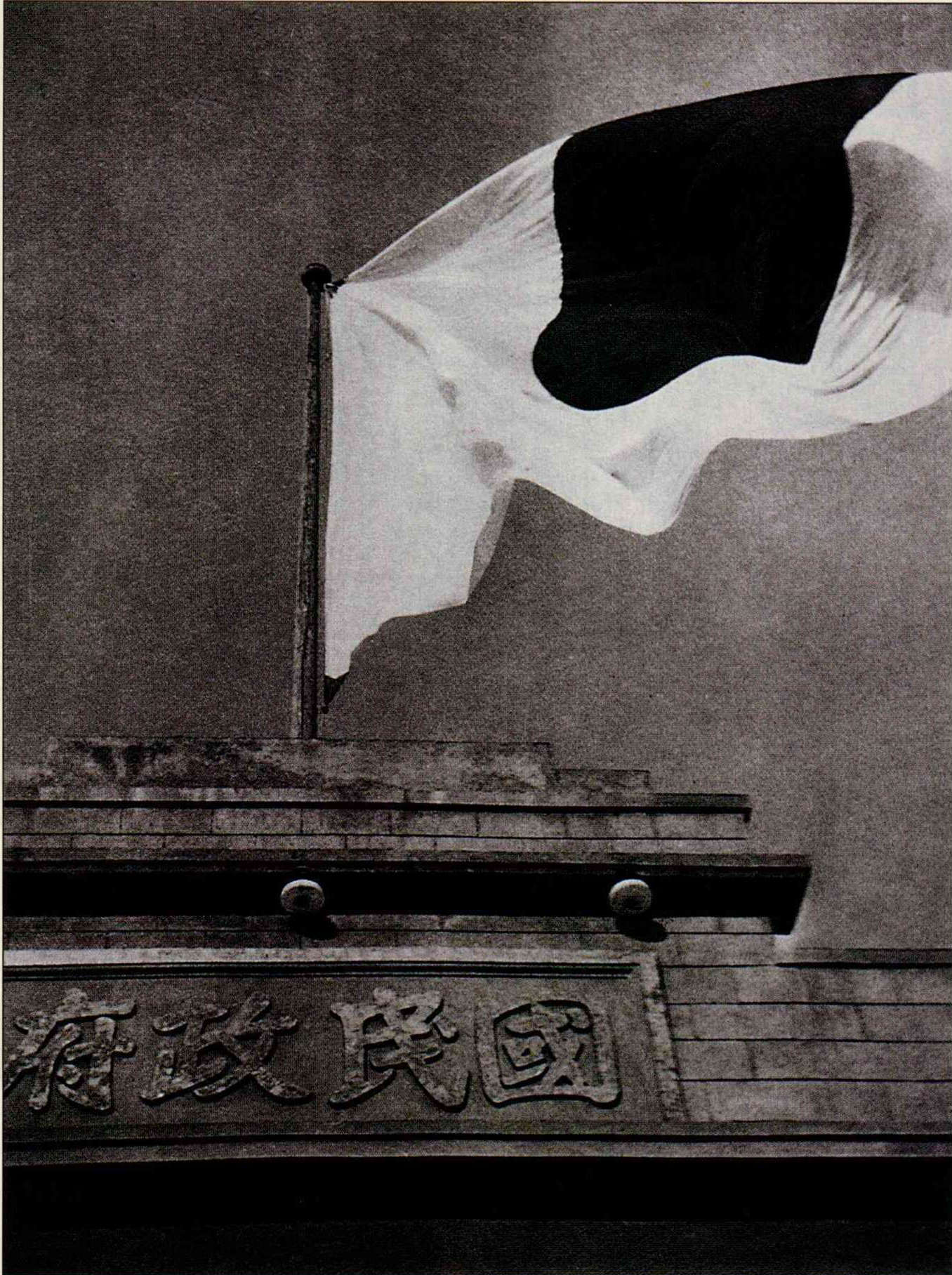 日本佔領南京國民政府後,由日本媒體拍攝的新聞照片。圖片說明:「飛揚於首都南京的日本旗,……,在吹著新東亞希望之風的蔚藍天空裡飛舞。」(取材自朝日新聞)