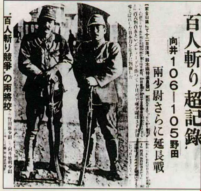 南京大屠殺期間,日本報紙報導日軍在戰役中進行殺人比賽。左邊的將校殺了一百零六人,右邊的殺了一百零五人。他們以一百五十人為目標,繼續競賽。(中國國民黨黨史會提供)