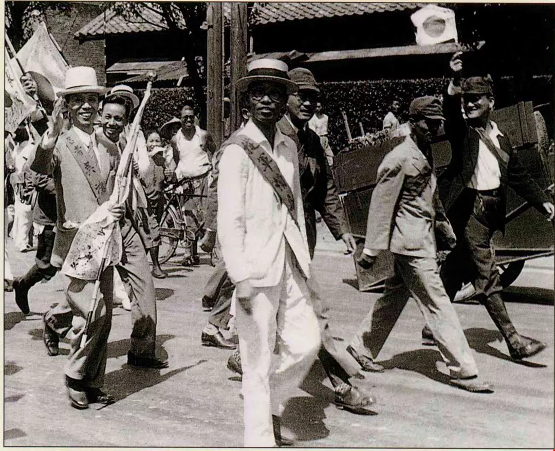 日本媒體在武漢淪陷後所拍的宣傳照。圖說寫著:「高舉建立東亞新秩序口號、邁向日支合作的漢口市民在救國大會上,宣誓『興亞』。」(取材自朝日新聞)(取材自朝日新聞)