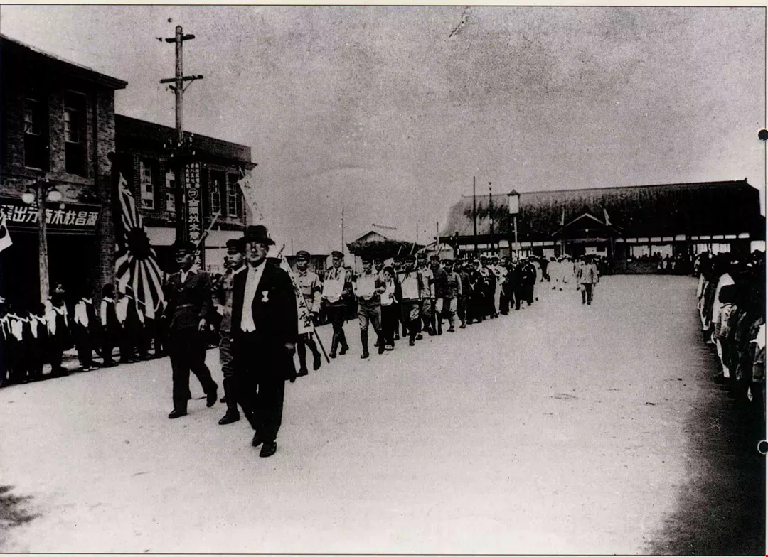 中日戰爭末期,身著燕尾服的羅東街長率各界至火車站,迎接戰死海外子弟的骨灰回鄉,中日戰爭期間,被徵調至海外的臺籍兵約二十萬人,戰死海外或生死不明的約五萬餘人。(陳晃提供)