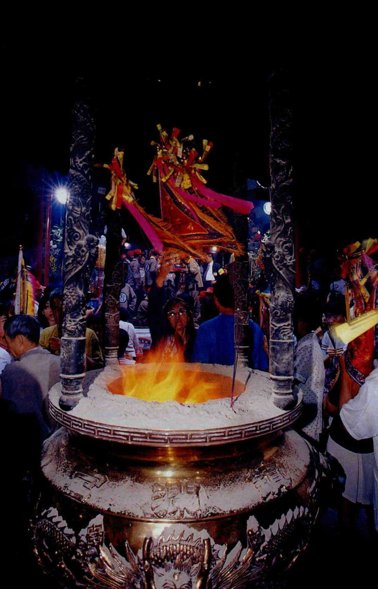 「發爐」被信徒視為神明靈驗、香火鼎盛的象徵,面臨是否繼續留在民進黨內的前主席許信良祭拜時發爐,一洗近日鬱卒,幕僚人員興奮不已。(新聞局葉銘源攝)