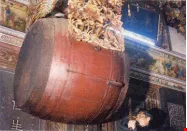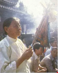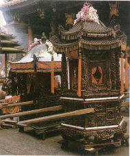 北港朝天宮的香爐旁放著大甲媽的香擔——這香擔也是隨香挑來的——獲准觀禮的人都肅立在一旁,等待隆重儀式的開始。三通鼓後,主祭和陪祭全頂香跪於大殿,誦經團誦念金剛經,意在祝神之無量福壽。誦經後,由朝天宮的住持和尚宣讀疏文,同時關閉廟門,所有的信徒都長跪廟外。疏文宣讀完畢,廟門復開,一時鞭砲大作。