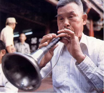 鎮日不斷的鞭炮聲、鑼鼓聲夾雜著喧騰的人聲,使得朝天宮幾乎要沸騰起來了。空氣中瀰漫著的,是宗教的狂熱與廟會的興奮;雲集的各式攤販、洶湧的人潮,阻塞了廟前的大小道路。春天的北港,因進香期的來臨,真個熱鬧非凡。