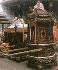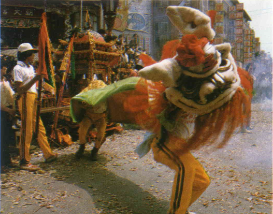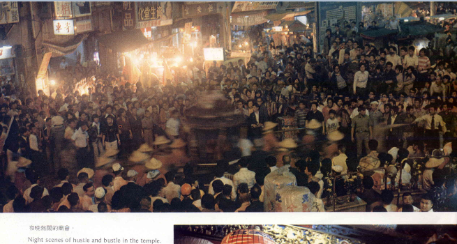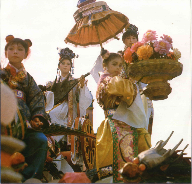 鑼鼓喧天,鞭炮聲不斷,平常難得一見的各種民間雜藝,全都出籠了。由各商業團體、各個鄰里承租的藝閣,也遊行街頭,古裝的、時裝的、靜態的、動態的、各式各樣的藝閣,叫人看得目不暇給,眼花撩亂。