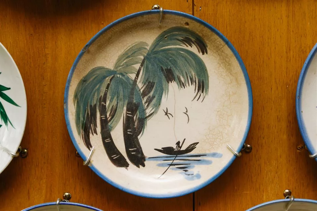 湛藍洋紅的碗盤彩繪圖案裡,館長簡楊同拿起一只碗底畫著椰子樹的碗公指出:「所有的圖案裡,這椰林風情最具台灣特色。」他解釋,東南亞雖是南洋熱帶國家,但飲食上使用盤子居多,繪有椰子樹這樣深具亞熱帶風情的碗,最能顯現台灣風情。