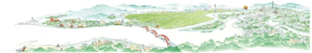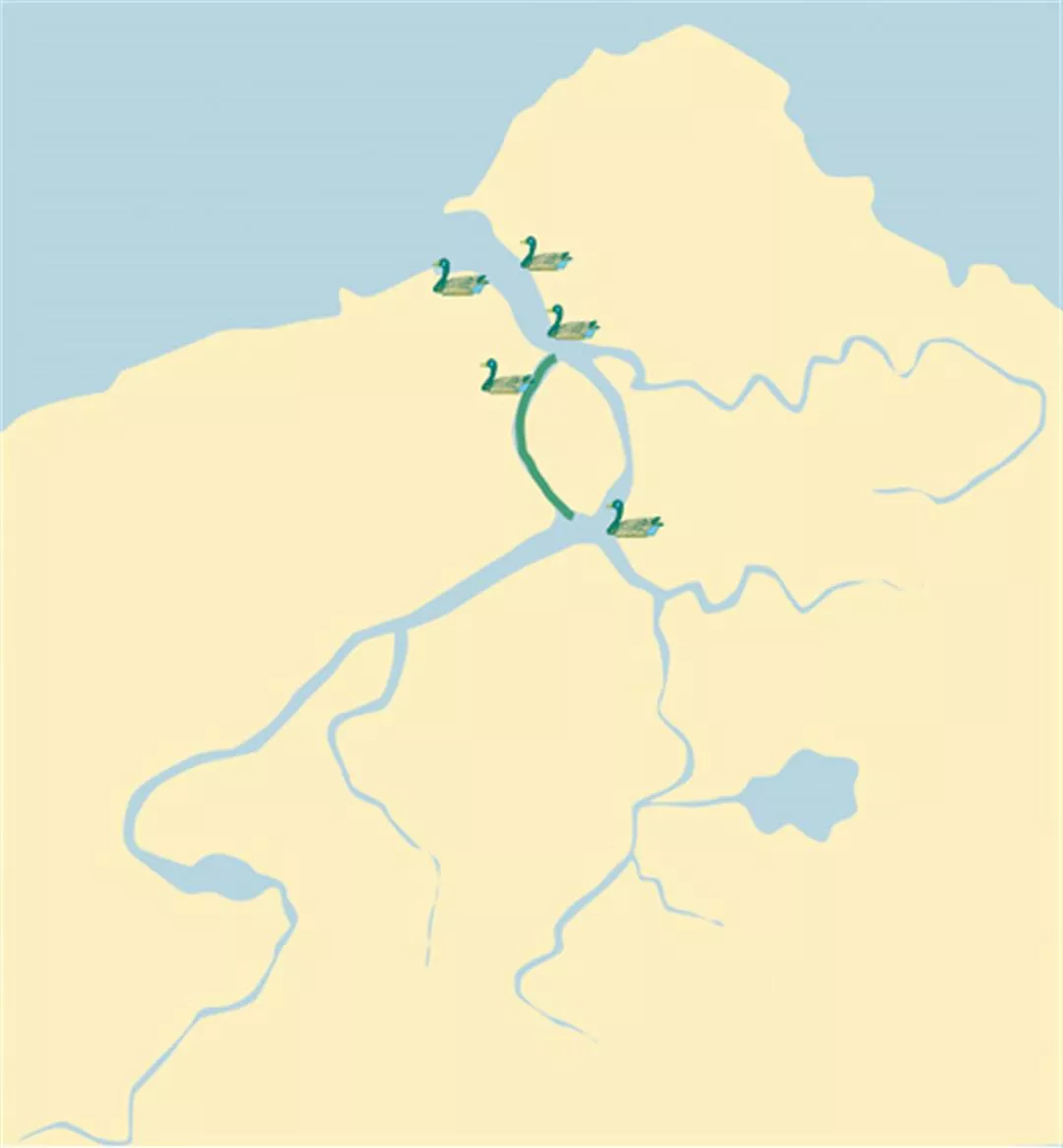 空中鳥瞰淡水河系,像極了一個正彎腰向前(西)奔跑的跑者,大漢溪是前腳,新店溪緊跟在後,胸腹是兩溪在板橋匯聚後的淡水河主流,擺盪在胸前的右臂是二重疏洪道,身後的左臂則是基隆河;關渡位在跑者頸項,關渡大橋彷彿一條閃亮項鍊。(對頁地圖)