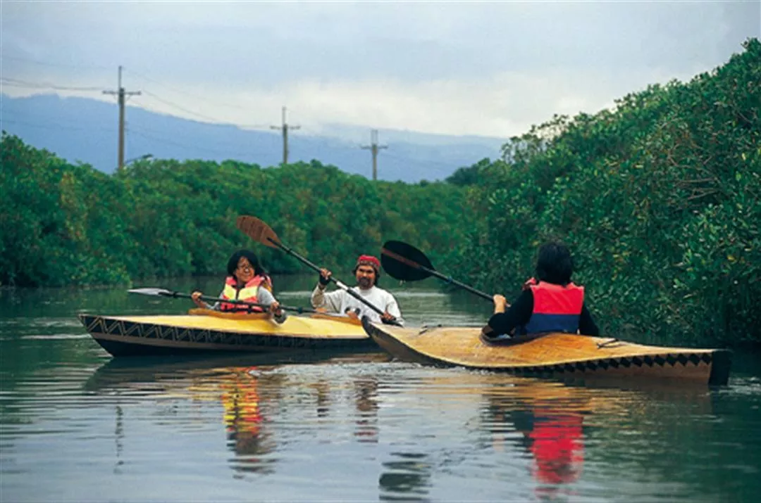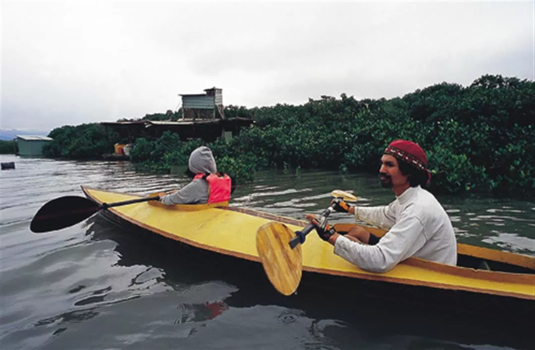 位於淡水河與基隆河交會處的「關渡自然公園」,因特殊的地理條件滋養出豐富的溼地生態,每年冬天吸引來自西伯利亞的水鳥群聚。(右)探尋淡水溼地有許多途徑,步行、騎車之外,划獨木舟可置身水中央,近距離感受河川脈動。