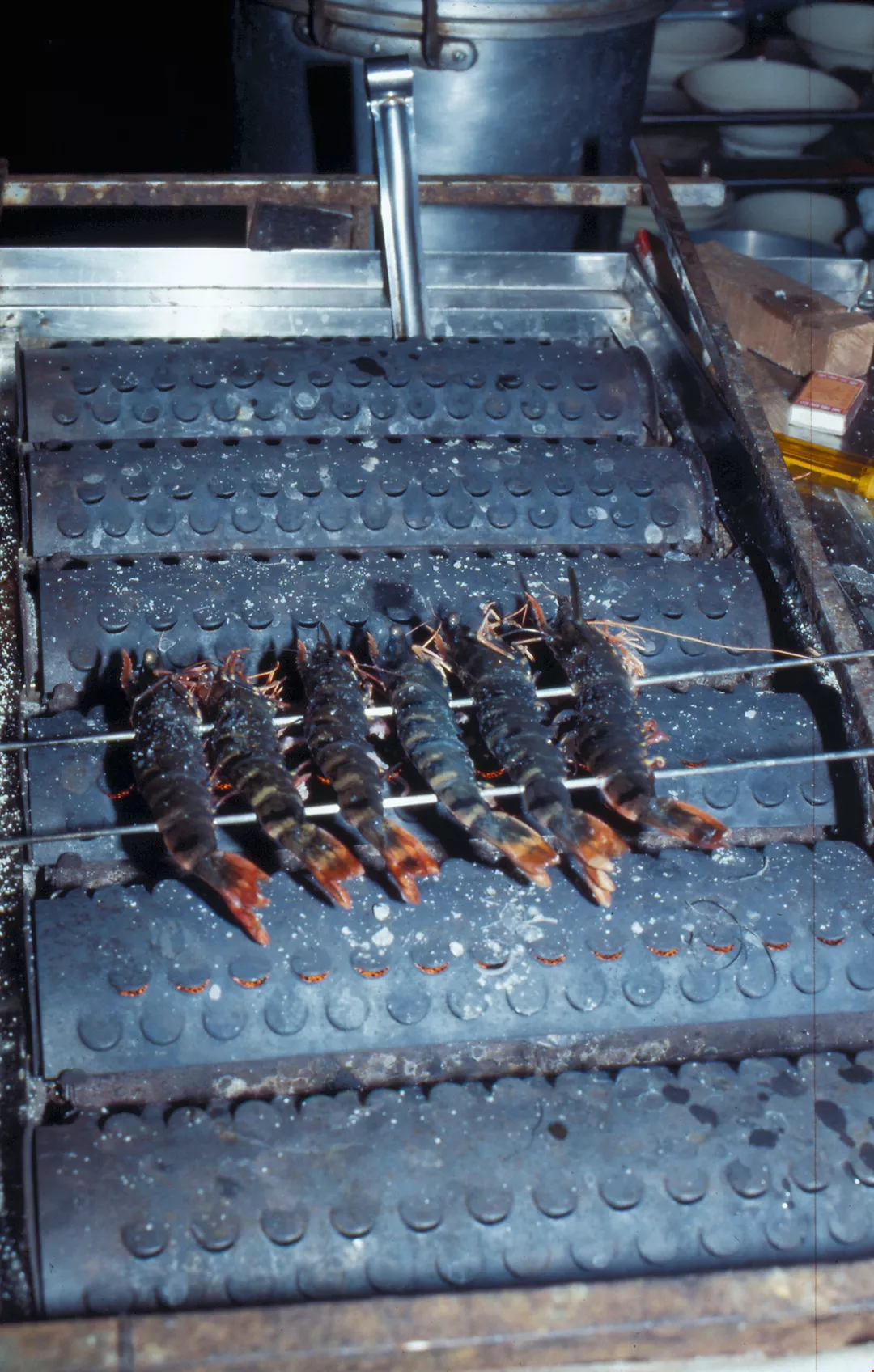 把活蝦串在鐵棍上,放在燒熱的鐵架上炙烤,也是夜市常見的一景。
