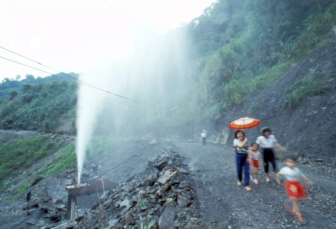 太平山山腳的仁澤溫泉噴瀉出來,遊客得打傘經過。這種熱噴泉可用來作地熱發電。(張良綱)
