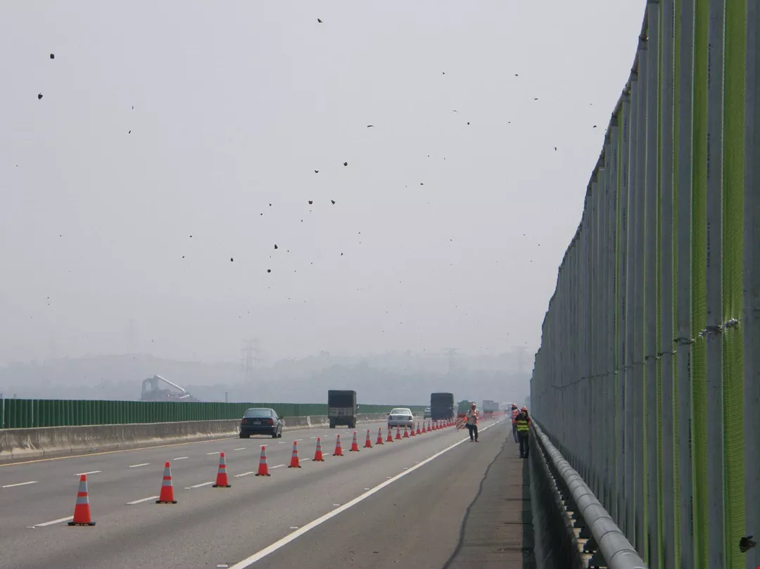 每年紫斑蝶北返時刻,公路單位在國道三號252公里處架設防護網。(台灣紫斑蝶生態保育協會提供)