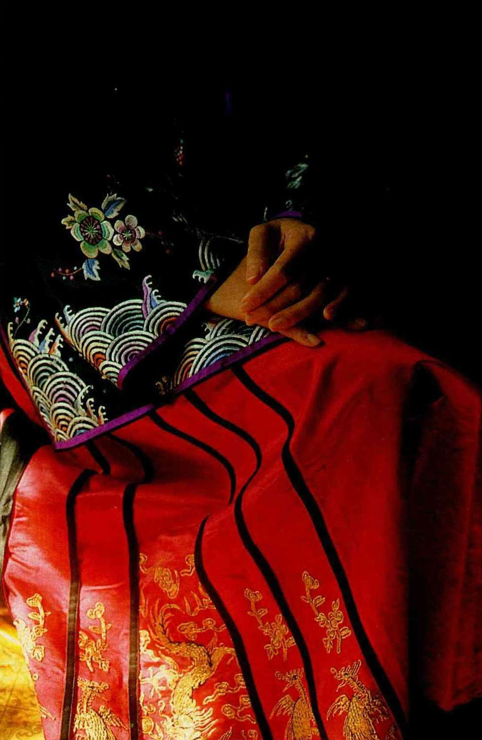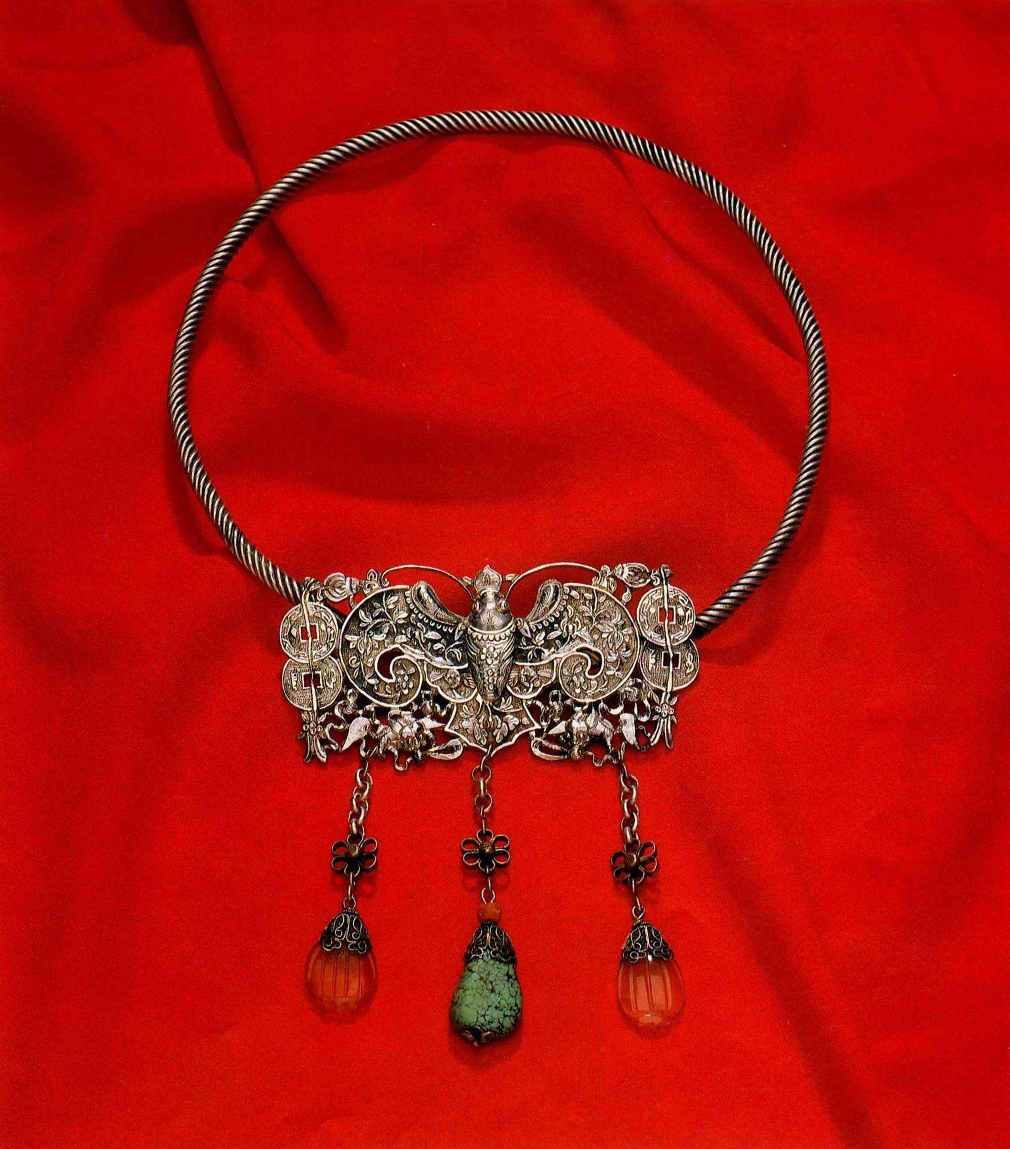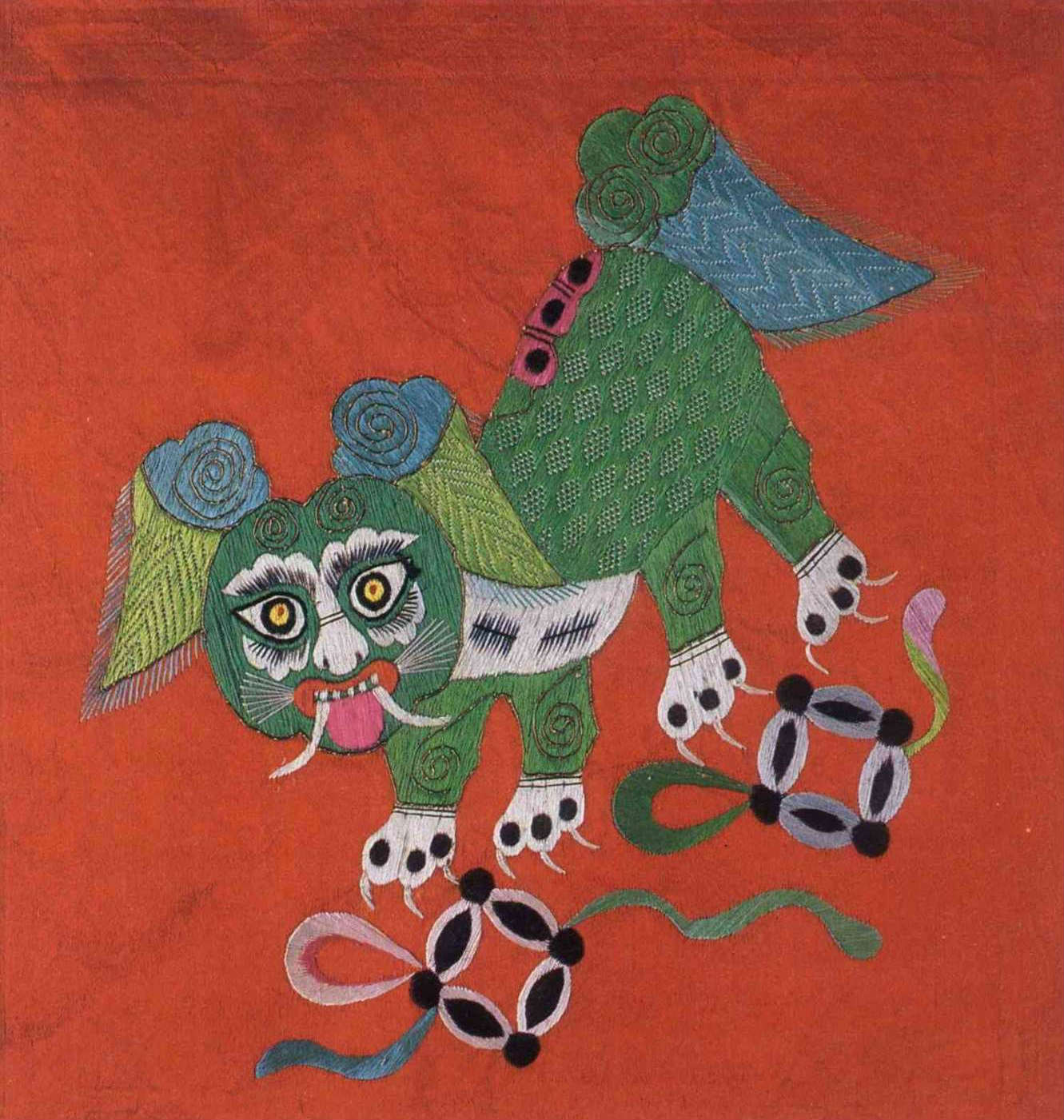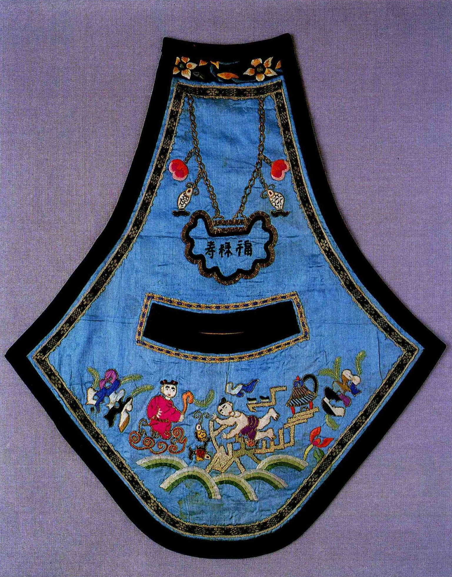 首飾、衣衫、鞋襪、巾帕等服飾則常繡上蝙蝠、壽桃與兩個古錢,寓意「福(蝠)壽(桃)雙全(錢)」。也有繡芙蓉配牡丹,寓意「榮(蓉)華(花)富貴(牡丹)」。