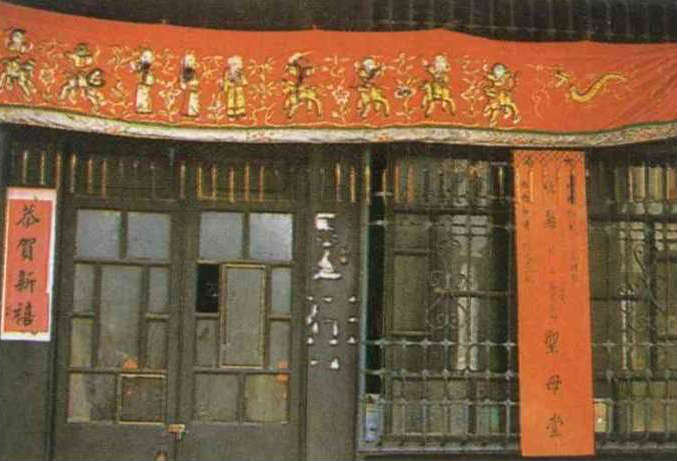 橫披在門前的「八仙彩」是結婚、祭神時不可缺少的門簾。(鐘永和)