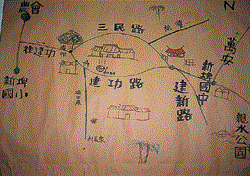 這個號稱建功大飯店的小麵攤,也是社區青壯輩聊天的據點之一。飯店的牆上,貼了一張牛皮紙手繪地圖,除了三山國王廟、古城門、村長家,另一個醒目的標誌,就是「建功森林親水公園」。