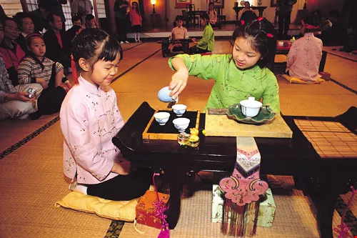 孩子們有模有樣的學習泡茶之道。休閒教育若能從小實踐於生活之中,長大了自然較能夠品味人生。