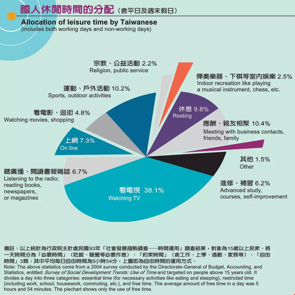 備註:以上統計為行政院主計處民國93年「社會發展趨勢調查──時間運用」調查結果,對象為15歲以上民眾。將一天時間分為「必要時間」(吃飯、睡覺等必要作息)、「約束時間」(含工作、上學、通勤、家務等)、「自由時間」3類;其中平均每日自由時間為5小時54分,上圖即為自由時間的運用方式。