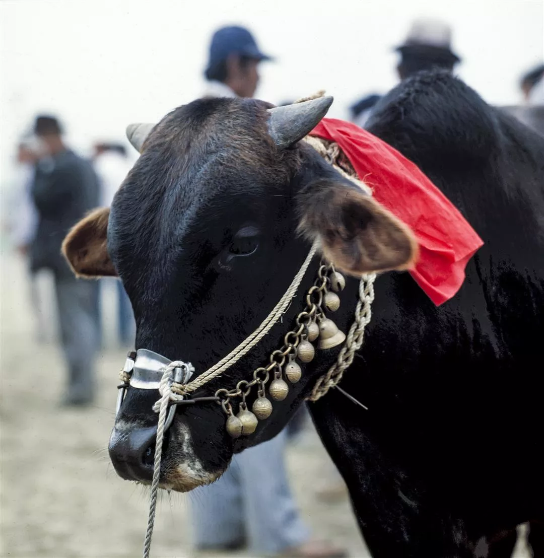 帶到墟上出售的牛被梳洗得光頭淨腳,並配飾牛鈴,紮上紅布條,裝扮得漂漂亮亮,讓購買者圖個吉利。(孟慶常)