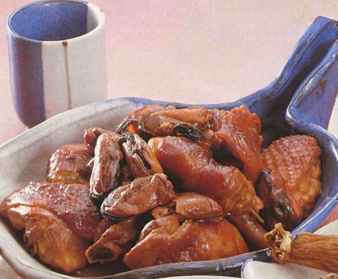淡菜燒雞 文‧漢光公司 1984 7月 EN 分享: 淡菜燒雞。 材料:雞腿兩隻(或雞半只)、淡菜三∼四兩、老薑一片、蔥一支、清水15碗。 調味料:醬油三大匙、酒一大匙、冰糖32大匙。 做法: 1﹒雞洗淨切成大塊。 2﹒淡菜先用溫水浸泡卅分鐘,再小心用手剝洗,尤其在腹溝深處有泥沙及一條划水羽足,應拔去洗淨。 3﹒雞塊、淡菜一起入鍋,放下拍扁的老薑、蔥,再加入所有的調味料及清水,先用大火煮滾,再改中火煮十∼廿分鐘,即可盛起供食。 備註:淡菜是一種貝肉乾,因富含荷爾蒙,對婦女十分滋補,可常食用。淡菜燒雞。淡菜燒雞。 分享: