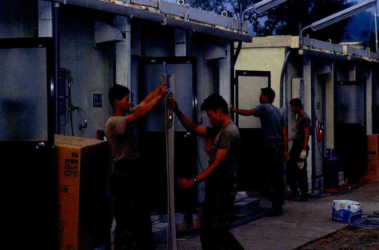 不論救災或重建工作,國軍官兵的援助和付出都令災民深深地感動。圖為國軍正在搭建臨時組合屋。(薛繼光攝)
